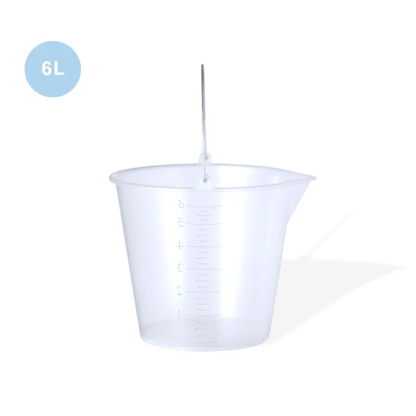 Emmer van 6 liter gemaakt van duurzaam transparant PP. Met metalen handvat en maatbeker aan de zijkant in ml voor snel en gemakkelijk aflezen. Afgeronde contour met schenktuit om morsen te voorkomen, plus een groot bedrukkingsoppervlak.