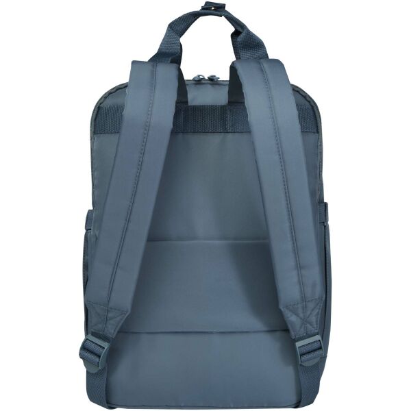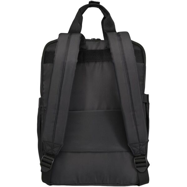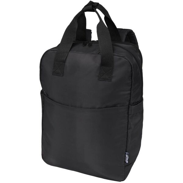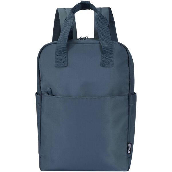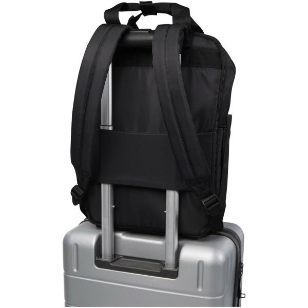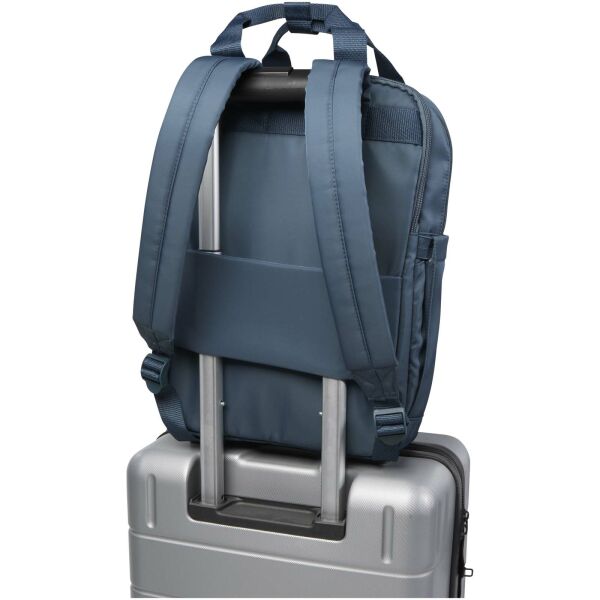 De Trip Aware™ gerecyclede laptoprugzak is een compacte, lichtgewicht rugzak ontworpen voor gestroomlijnd reizen en dagelijks gebruik. De rugzak is gemaakt van duurzaam 290D twill polyester met een zachte gebreide achterkant en gevoerd met RPET 210D/PU en combineert functionaliteit met een strak, praktisch ontwerp. Hij heeft twee zijvakken voor waterflessen, dubbele handgrepen en comfortabele schouderbanden. In het voorvak met rits kun je een paspoort, pennen en sleutels overzichtelijk opbergen, terwijl je in het hoofdvak ruimte hebt voor een notitieboek of tablet. Een apart 14" laptopvak en een trolleyhoes aan de achterkant maken hem bijzonder geschikt voor op reis. Elke tas wordt ook geleverd met een Aware™ tracer. Met deze innovatieve functie kunnen gebruikers de oorsprong en de reis van hun artikel volgen via een QR-code, waardoor de transparantie in de toeleveringsketen wordt vergroot en er een sterkere band is tussen het product en het productieproces. Inhoud: 9 liter.